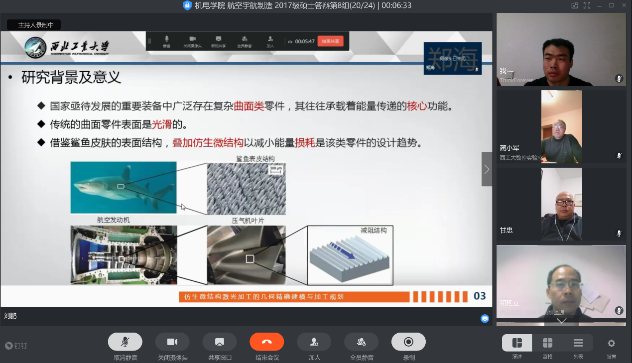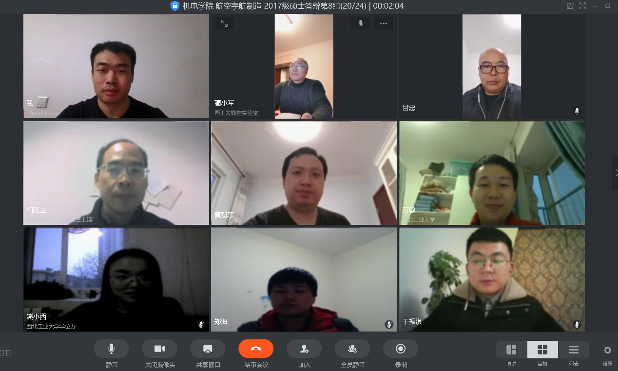 答辩正式开始,秘书周建强老师宣布新葡萄8883官网AMG官网航空宇航制造工程专业 2017级硕士研究生第八答辩小组硕士答辩会议开始,宣读了答辩委员会主席和成员,并介绍了整个答辩流程。本次答辩由和延立副教授担任前2位研究生的答辩委员会主席,万敏教授担任后7位研究生的答辩委员会主席,其他委员会成员为甘忠副教授、黄魁东副教授和蔺小军研究员。随后,9名学生依次有序地进行了视频答辩。按照预演模拟时的安排,学生进入答辩时,打开话筒和摄像头,其他学生关闭话筒和摄像头以避免干扰。在答辩委员会主席的主持下,首先由答辩秘书对答辩研究生的基本情况、论文评阅情况进行说明和介绍,然后由答辩学生宣读《学位论文原创性声明》,并开始共享屏幕进行答辩汇报,之后由答辩委员会进行问题质询。学生在答辩过程中答辩流畅,采用钉钉的录像功能对答辩全程进行录音、录像,并专门安排了其他设备进行了录音备份。校研究生院学位办邢妍老师参与了视频答辩全过程,校督导组毛根旺老师听取了最后两名学生高新宇和郑海的答辩。
