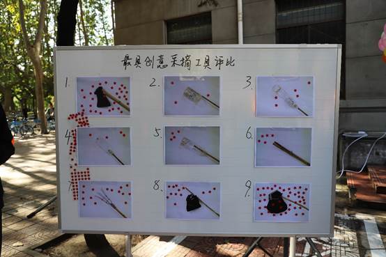 随着摘柿子活动的进行,创意采摘工具的评选也同时开始。赛前,我校学子们化身手工艺大师,从设计图纸到手工制造,用聪明才智创造各种神器,采用废旧材料、“十八道”工序精心制作了环保的采摘工具。