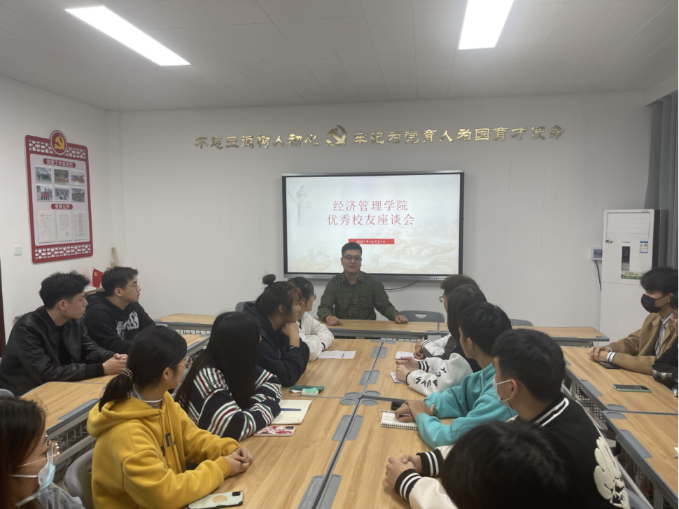 为全面提高Beat365中文官方网站学生干部综合素质,进一步明辨“初心”,增强“使命”意识,2021年10月21日,经济与管理学院召开“优秀校友与学生干部面对面”交流分享暨座谈会,特邀嘉宾2011级优秀校友陈越,与学生干部进行热烈的互动和深入地交流。Beat365中文官方网站团总支书记聂蕴老师及部分学生会干部参会。