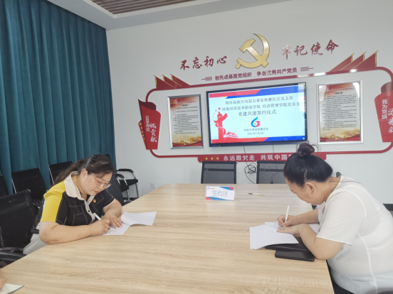2021年7月2日上午,Beat365中文官方网站Beat365中文官方网站党总支与郑州高新区沟赵办事处秋雅社区党支部在秋雅社区党群服务中心举行党建共建签约仪式。