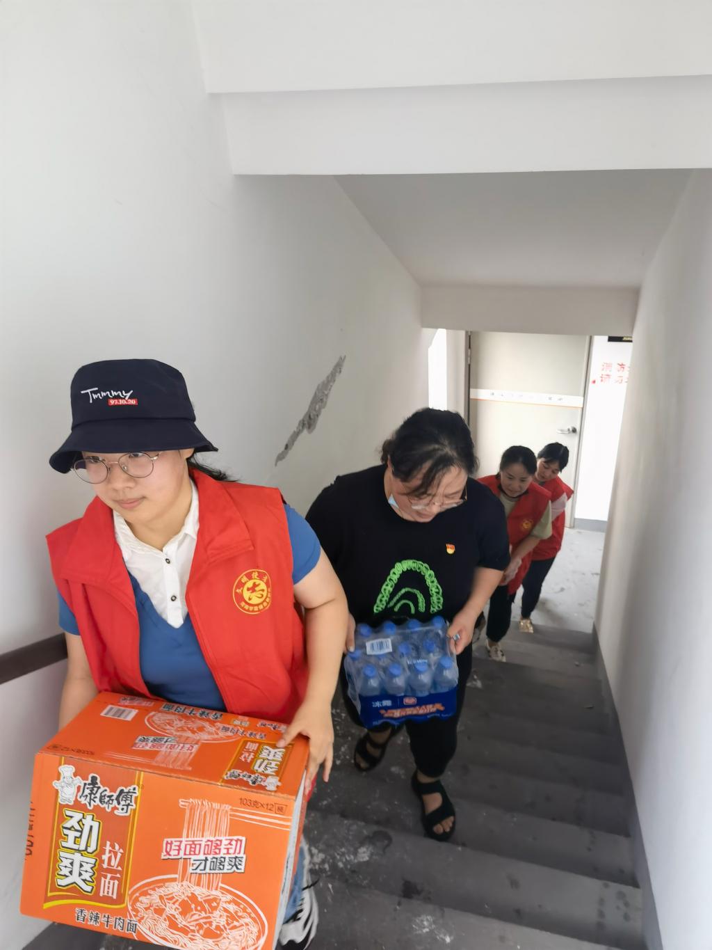 该小区内都是高层楼房,由于地下室被淹,造成停水停电,有很多是困在家里无人照顾的老人、小孩及孕妇,现急需把救灾物资徒步运送上楼。党员教师们毫不犹豫的扛起物资,从1楼到34楼挨家挨户进行分发,当受灾群众打开门看到浑身湿透、气喘吁吁的志愿者们,他们非常的感动,没想到来得这么快,真及时,口中表达真诚的感谢。经过半天的努力,所有物资全部分发完毕。
