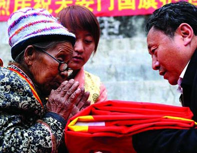 次仁曲珍老阿妈是西藏边境县聂拉木县樟木镇邦村人,1910年6月6日出生,20世纪40年代,她和同村的普布结了婚,不久丈夫病逝,她终身没有再婚,膝下也无子女。西藏民主改革前,次仁曲珍曾是背夫,承担着繁重的苛捐杂税和服不完的徭役,生活毫无希望。民主改革后,次仁曲珍同西藏百万农奴一样翻身做了主人,过上了好日子。她经常跟别人念叨:“感谢党,感谢解放军!没有党,我们农奴摆脱不了万恶的旧制度,没有解放军,我们过不上幸福的新生活。”次仁曲珍不仅这样说,还体现在自己的实际行动中。从民主改革至离开人世的50多年时间里,她风雨无阻地每天在自家院子里升挂国旗。在生病时,她仍然挣扎起来升挂国旗,实在起不了身,也叮嘱来照看她的人帮忙升挂国旗。五十年如一日,次仁曲珍老阿妈的坚持,慢慢、深深地感染着大家,她每天在山头升起五星红旗成为了当地人们每一天生活的开始。次仁曲珍就是用这种朴实无华的方式来感谢党和政府,表达一位藏族老阿妈真挚而深厚的爱国情怀。