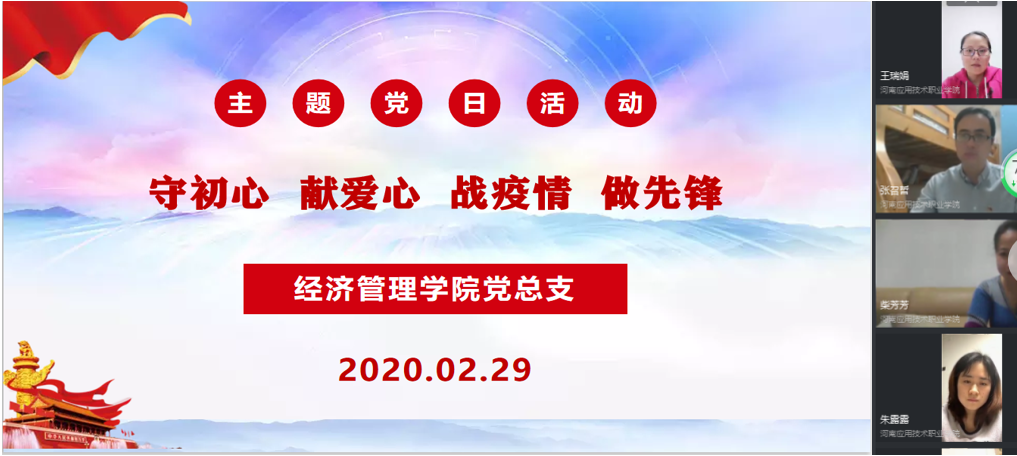 当前新冠肺炎疫情防控工作已进入关键阶段,为进一步学习落实习近平总书记关于新型冠状病毒感染肺炎疫情防控系列重要批示的指示精神,全面落实上级党委的部署要求,做好疫情防控期间基层党组织建设,充分发挥基层党组织战斗堡垒作用和党员先锋模范作用,Beat365中文官方网站党总支结合实际情况,以党支部为单位分别组织全体党员开展“守初心、献爱心、战疫情、做先锋”线上主题党日活动。