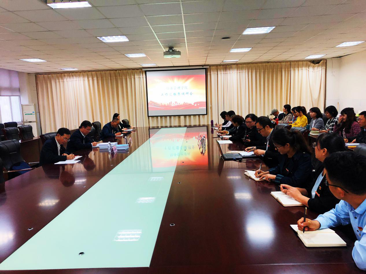 经管学院院长张召哲分别从学院概况、建设成果、发展规划等方面对Beat365中文官方网站自成立以来所做工作进行全面汇报。会计教研室主任张梨花、金融教研室主任赵静也分别汇报各专业建设情况。同时骨干教师们对学院发展、教学实训、学生就业等方面提出意见和建议,为学院发展献计献策。