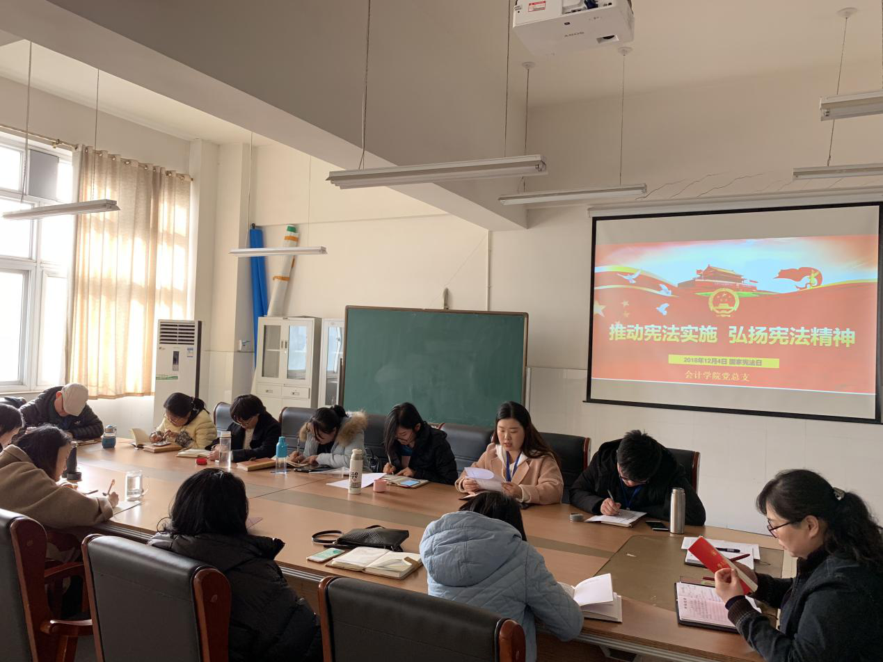 为深入学习贯彻党的十九大精神,进一步树立宪法法律权威,强力推进法治校园建设,提高广大师生法律意识,营造尊法、学法、守法、用法的浓厚氛围,会计学院党总支组织全体教师在全国第五个国家宪法日12月4日下午开展学习宪法活动、学习党委文件精神。会议由会计学院书记李兆楠老师主持。
