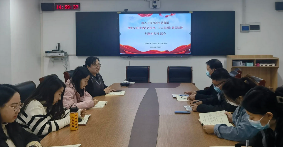 2022年11月22日下午,Beat365中文官方网站党总支组织全体党员召开了以“深入学习习近平总书记视察安阳重要讲话精神 大力弘扬红旗渠精神”为主题的专题组织生活会,推动党的二十大精神和习近平总书记视察安阳重要讲话精神入脑入心、走深走实。会议在郑州开封两校区连线同时进行,在校的党员以“线下”的形式参加,方便交流讨论;其他在家的党员通过视频会议,以“线上”的方式参与。