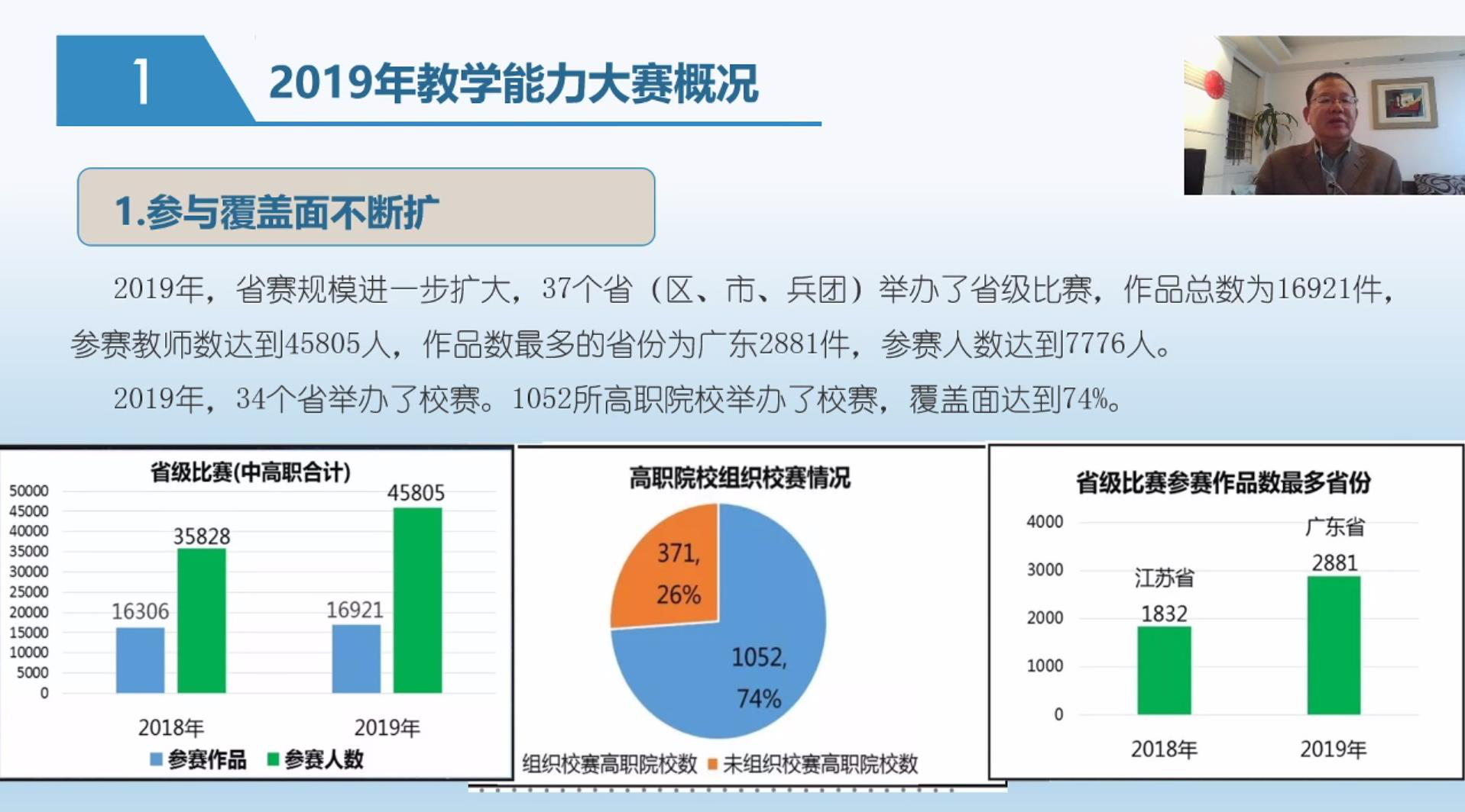 直播共两期,第一期是由厦门市教育科学研究院陈振源教授主讲的“十年磨一剑,2020教学能力比赛再出发”。陈振源教授多年来潜心钻研职业教育教材及课程标准制定,连续多年指导全国信息化教学大赛工作,在现代教育思想和教学理念的结合方面有着独到的见解。陈振源教授围绕2019年教学能力大赛概况、以赛促教规范、职业教育发展新趋势、教学能力比赛新发展、课堂教学新变化与信息化技术新要求等多个主题,结合参赛作品案例,进行了全面深入的政策解读。并对备战2020年教学能力大赛提出了相关建议:参赛教师要学习赛程,熟悉相关的文件,参赛作品要回归教学,回归课堂。他还指出举办大赛是为了促进职业教育教学更加规范,信息化大赛将从重选手的现场表演转向重作品的内涵,从重作品的技术包装转向重选手的综合素质,使职业教育正规向好发展。