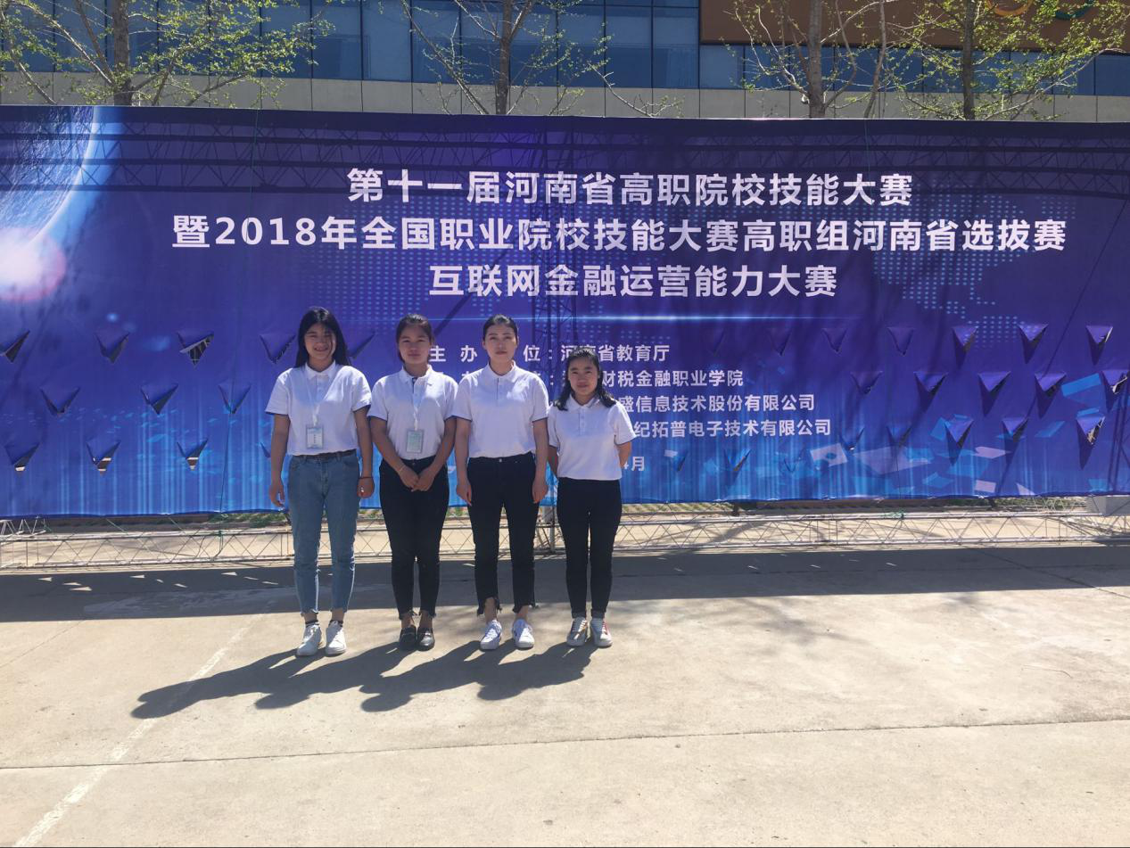 4月7号上午,河南省教育厅主办,郑州财税金融职业学院承办,深圳智盛信息技术股份有限公司支持的河南省高职院校互联网金融运营能力技能大赛胜利召开。本次比赛共有23支高职院校队伍参加。我院李小闯、刘丹花老师带队,会计学院学生冯欣、甄莹莹、康含笑和宋英戈四位同学组队参加了本次比赛,并取得了三等奖的优异成绩。