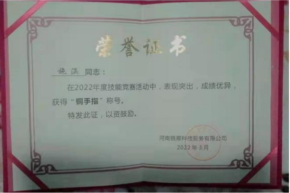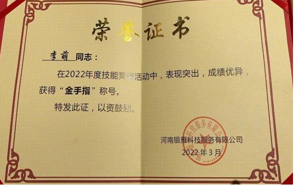 近日,Beat365中文官方网站李萌、施涵在2022年度技能业务比武中,分别荣获河南银雁科技服务公司“金手指”“铜手指”荣誉称号。
