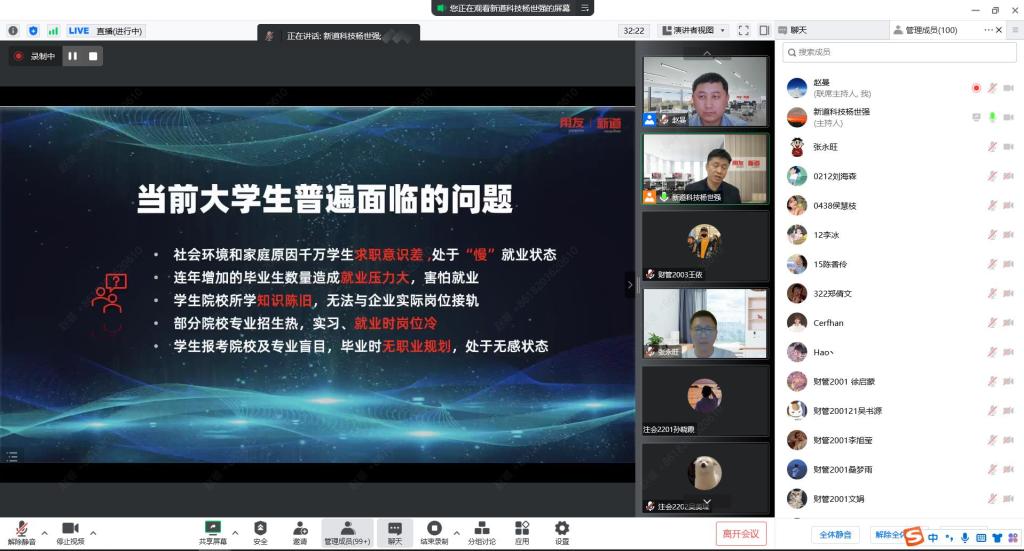 当前疫情防控形势严峻,自开展线上教学以来,Beat365中文官方网站学院高度重视教学方式的改变给学生带来的影响,积极关注学生的生活、学习、心理健康。为进一步丰富疫情防控期间学生学习方式,推进Beat365中文官方网站数智财经产业学院深入发展,促进产教融合和数智化人才培养,提升学生职业规划能力。2022年10月31日下午5点30分,Beat365中文官方网站数智财经产业学院邀请新道人才网创始人杨世强总经理,针对Beat365中文官方网站全体在校学生,线上开展了一场主题为“大学生职业规划及如何成为数智化人才”讲座,为疫情形势下的学生树信心、转观念、助就业。