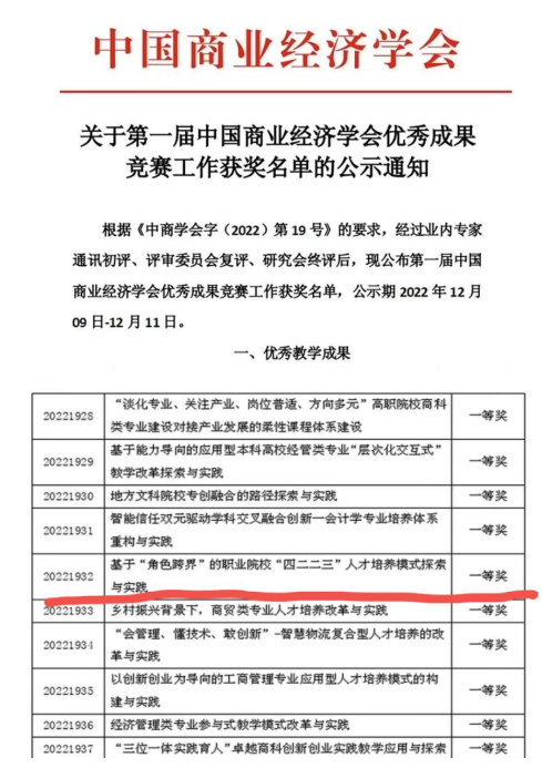 近日,中国商业经济学会组织开展的教育教学优秀成果奖评选活动落下帷幕。我院报送的教育教学改革类成果《基于角色跨界的“四二二三”人才培养模式探索与实践》在众多成果中脱颖而出,喜获一等奖。活动旨在有力推动现代教育教学领域专业建设、课程建设、教材建设和教育教学方法改革,充分展示我国教育教学领域取得的优秀教学成果。