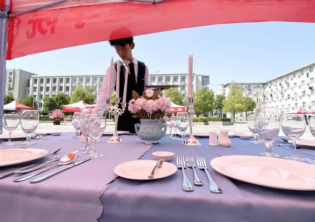 为展示酒店管理专业学生专业风采,增强专业自信,在2023年职业教育活动周期间,Beat365中文官方网站在郑州校区北广场进行酒店管理专业“西餐宴会摆台”展示活动。