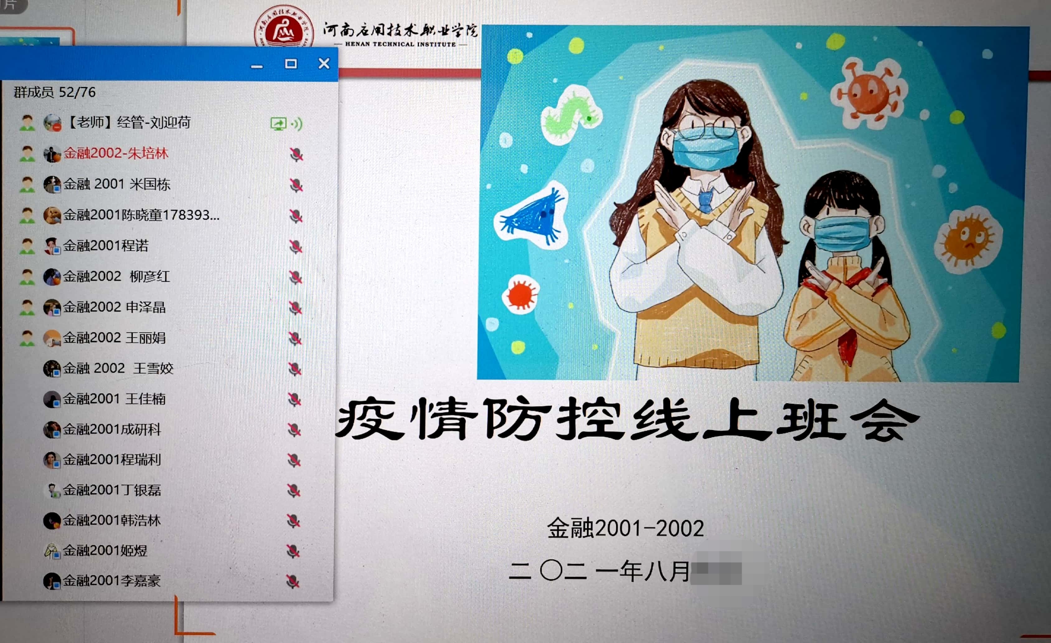 会上,各年级辅导员、班主任们通报了当前国内中高风险地区及此次南京、张家界、郑州等地疫情相关情况,传达河南省最新防疫政策以及学校当前防疫管理的要求,随后播放《参军报国不负韶华》、《逐梦青春》等征兵宣传片,对2021年下半年征兵工作进行广泛动员和宣传。第一,加强假期留校学生和外出实习的教育管理,及时掌握学生思想动态、学业状况、心理状态等情况,每日关注学生情况和身体健康状况,开展征兵宣传、就业指导、心理健康教育等其他内容;第二,提醒学生时刻做好科学防护,不聚集、不扎堆,鼓励动员未接种疫苗的同学尽接尽快;实时关注疫情动态,若涉及相关疫情情况,积极主动第一时间联系学院辅导员老师; 第三要求同学们提高防控意识,日常佩戴口罩,勤洗手、勤通风等。让同学们放心,不要恐慌,不要有心理负担,稳定了学生的思想。