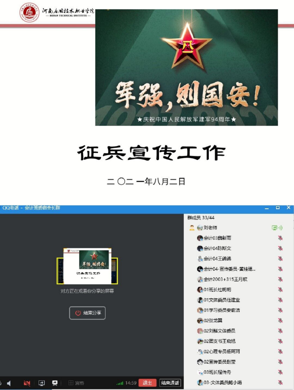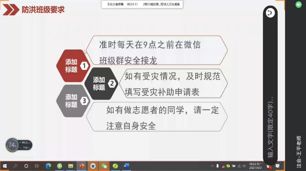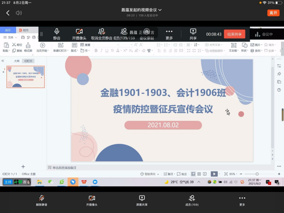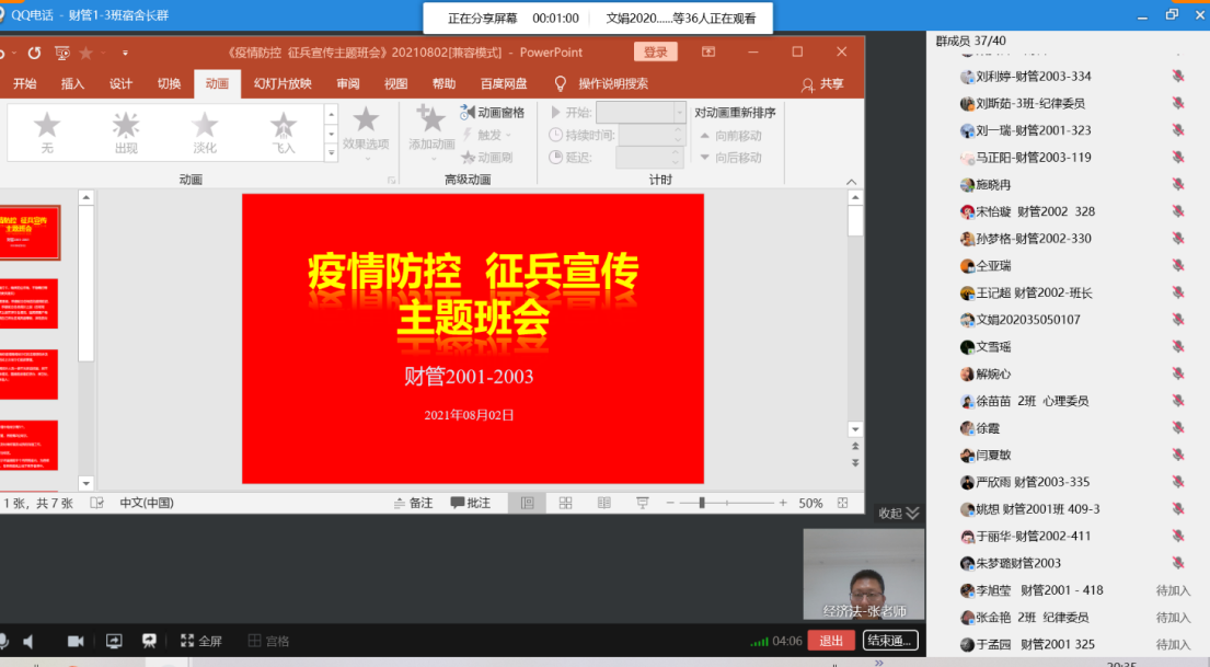 基于当前新冠肺炎疫情形势变化复杂,为进一步落实学校疫情防控工作要求,持续加强大学生思想政治教育,帮助同学们顺利度过一个充实、愉快、安全的假期,Beat365中文官方网站19级、20级全体班主任、辅导员于8月1日、2日两天,组织各班召开了线上疫情防控暨征兵宣传主题班会。