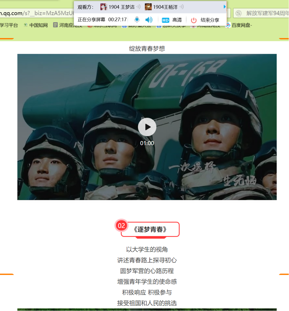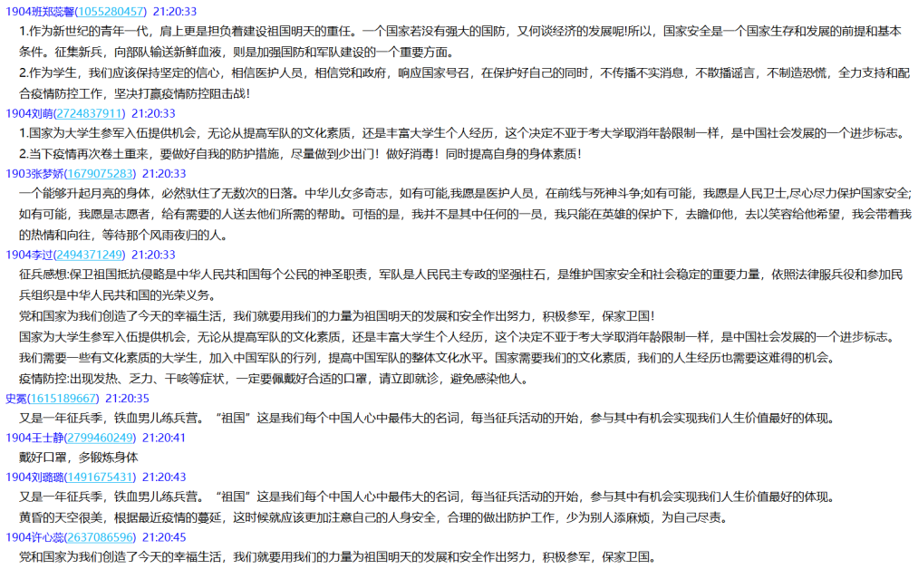 线上班会结束后,学生纷纷表示激发了大学生参军入伍热情,“合理规划,不负韶华”;面对疫情要做到“科学认知,坚定信心, 做好防护,坚持打卡”,以精神饱满的姿态迎接新学期的到来。