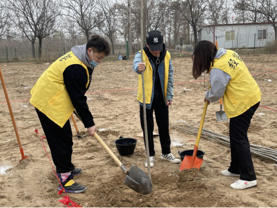植树现场,红色党旗迎风飘扬,党员师生个个奋勇争先。大家肩扛树苗、挥锹挖坑、扶正树干、填埋新土、踩实土壤,两人一组相互协作、相互配合,严格按照“三埋两踩一提苗”的方法合力栽下一棵棵树苗,展现出一片热火朝天的劳动场景。看到一株株树苗巍然屹立于黄河河畔,想着茁壮成长后变成一道靓丽的绿色风景,所有人的辛勤付出终将会收获绿色希望。参加植树的师生纷纷表示,要以实际行动践行习近平生态文明思想,为建设生态郑州、美丽郑州贡献一份力量。