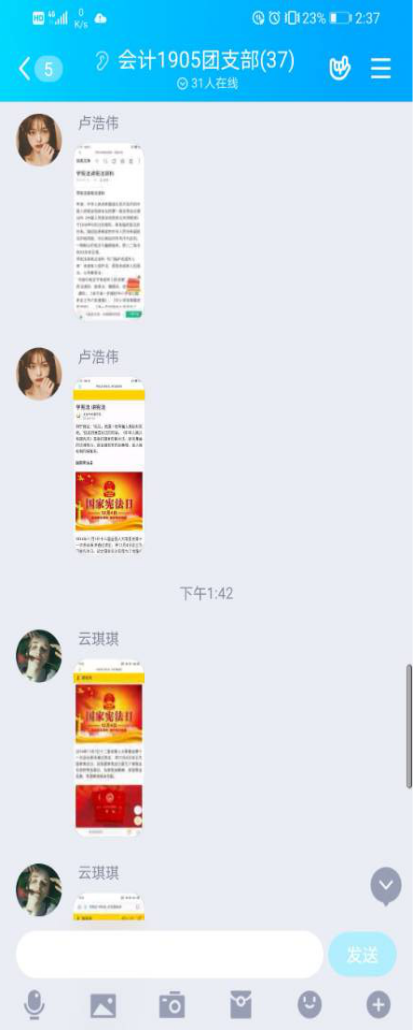 一、学习宪法知识,提高宪法意识。各团支部前期积极筹备团课材料,以不同的形式开展此次团课,其中,会计1903团支部由团支书马如意为大家简单介绍了:“中华人民共和国宪法是中华人民共和国全国人民代表大会制定和颁布的国家根本大法,规定国家的根本制度和根本任务,公民的基本权利和义务,国家机构的组织原则和职权。宪法具有最高的法律效力,一切法律、法规都必须依据宪法,都不得同宪法相抵触。”然后播放了一个视频给大家深入介绍了宪法的内容以及作用。期间,同学们表现积极,认真观看了视频,反响良好。注会1902班团支部组织团体学生积极学习新中国宪法的发展历程、宪法的意义、宪法的作用等有关宪法的知识。“宪法是我国的根本法,是治国安邦的总章程”。宪法在根本上和宏观上确定着控制国家权力的基本原则、基本制度和基本方法。而宪法确定这些基本原则、基本制度和基本方法的最高价值是维护人的尊严,可以说,宪法所确定的基本原则、基本制度和基本方法都是围绕着如何更好地维护人的尊严而展开的。一切国家权力均来源于宪法并受制于宪法,宪法不仅控制着整个国家权力,而且国家权力之组成部分的立法权、行政权和司法权的运行和展开,守法是青年学生健康成长的需要,不仅要学习宪法知识,提高宪法意识。