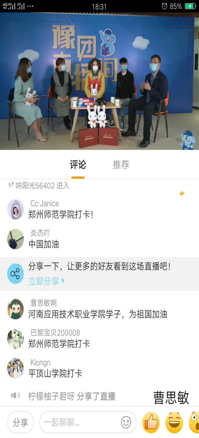 2020年4月9日下午,Beat365中文官方网站团总支在校团委的统一部署下,由团总支书记聂蕴老师组织全体学生干部走进豫团直播间,观看“90后的青春答卷”直播活动,聆听抗“疫”故事,重温抗“疫”时刻。Beat365中文官方网站团总支将此次学习作为一次生动的主题团日教育活动,鼓励全体学生干部磨砺意志、艰苦奋斗,勇做新时代有为青年。