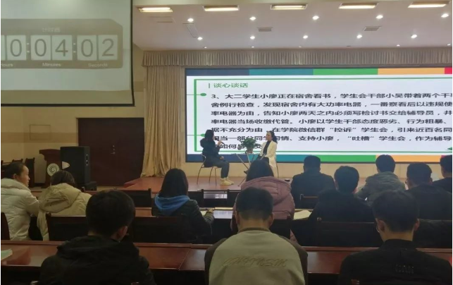 首先,主持人介绍大赛规则,此次选手所答题目均为抽签选定。大赛分为三轮:谈心谈话、案例分析和理论宣讲,通过三轮比赛来综合考察辅导员语言表达能力、活动组织策划及实施能力、思想教育和心理辅导能力、日常事务处理能力等多方面的知识和技能。