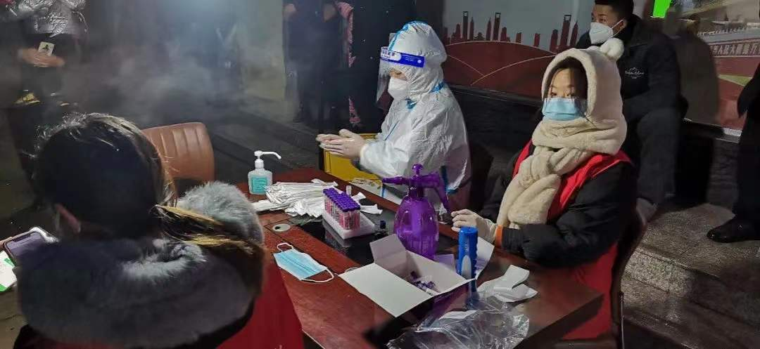1月2日晚禹州市疫情暴发,同时社区发布信息召集志愿者。经管学院会计2001班安俞洁第一时间响应号召,积极报名。医生还没有到达,许多居民就已经搬着小板凳在等待做检测。到了晚上十二点的时候一切才准备就绪,当时的天气十分寒冷,大家都很焦急,还有的抱着孩子排队十分困难,志愿者们在旁边安抚着大家的情绪,做好服务工作。