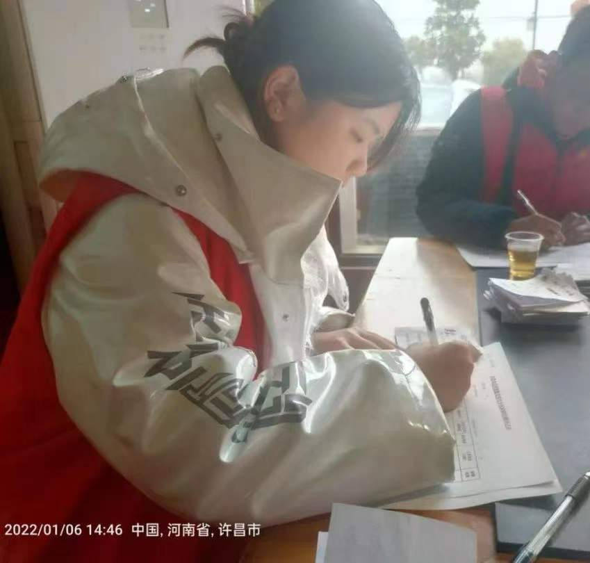 在寒冷天气下,她与其他值班志愿者们坚守在防疫关卡的岗位上。不论天气如何,她始终提前到达岗位,坚守到最后一刻。在身体和精神的双重疲惫下,对待疫情防控方面却没有丝毫的放松,对每一个入村的村民,指导扫码,认真做好登记,如实测量体温,尽职尽责,为抗击疫情献出自己的一份力量。