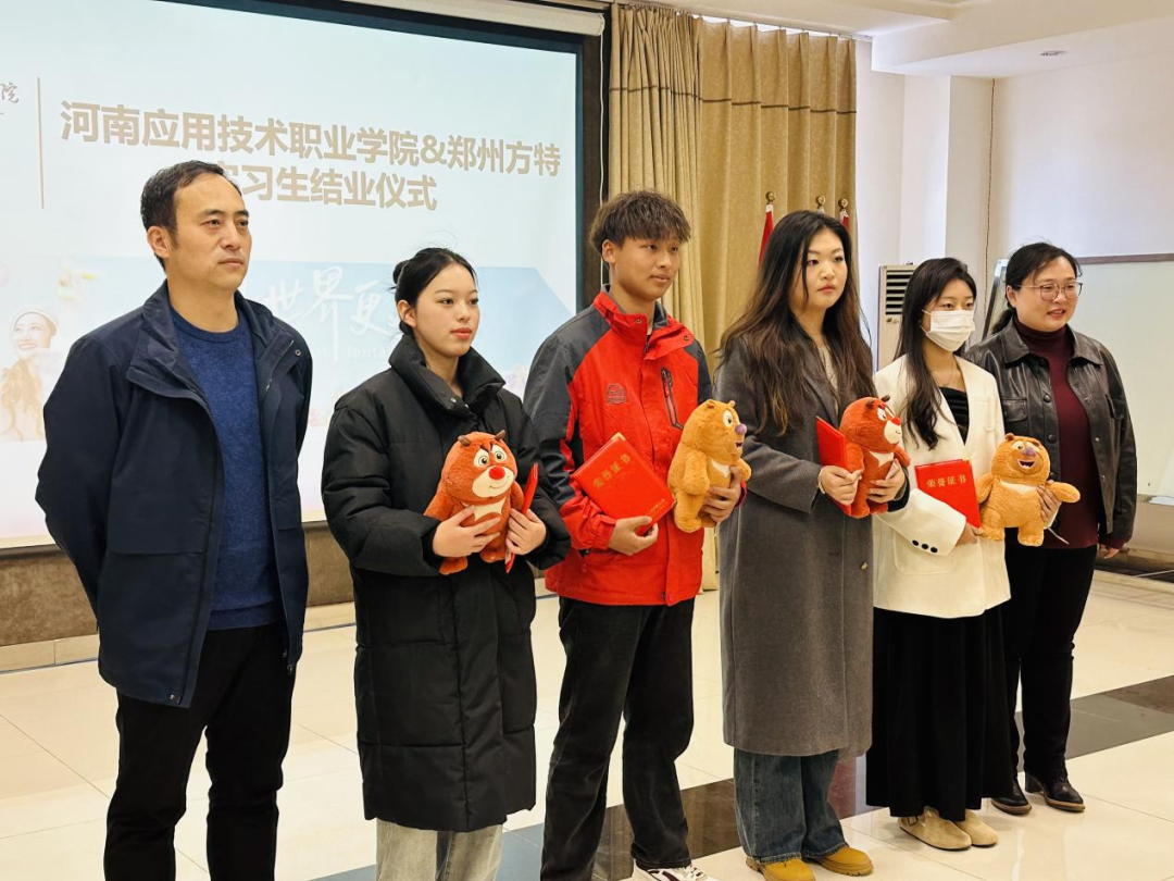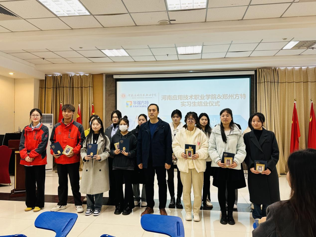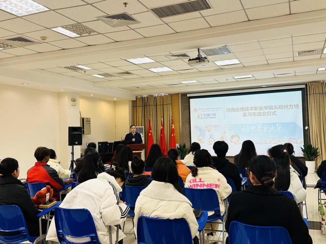 12月7日,Beat365中文官方网站党总支书记李兆楠、院长张召哲一行赴郑州方特参加实习生结业仪式。郑州方特人力资源中心主任姚真真、28名实习生参加结业仪式。