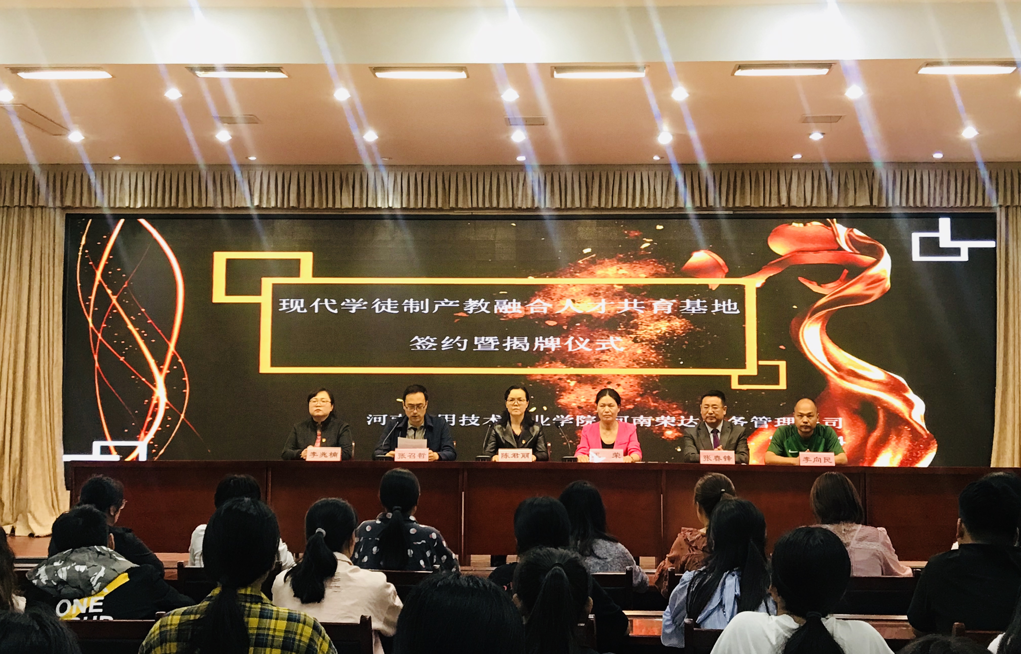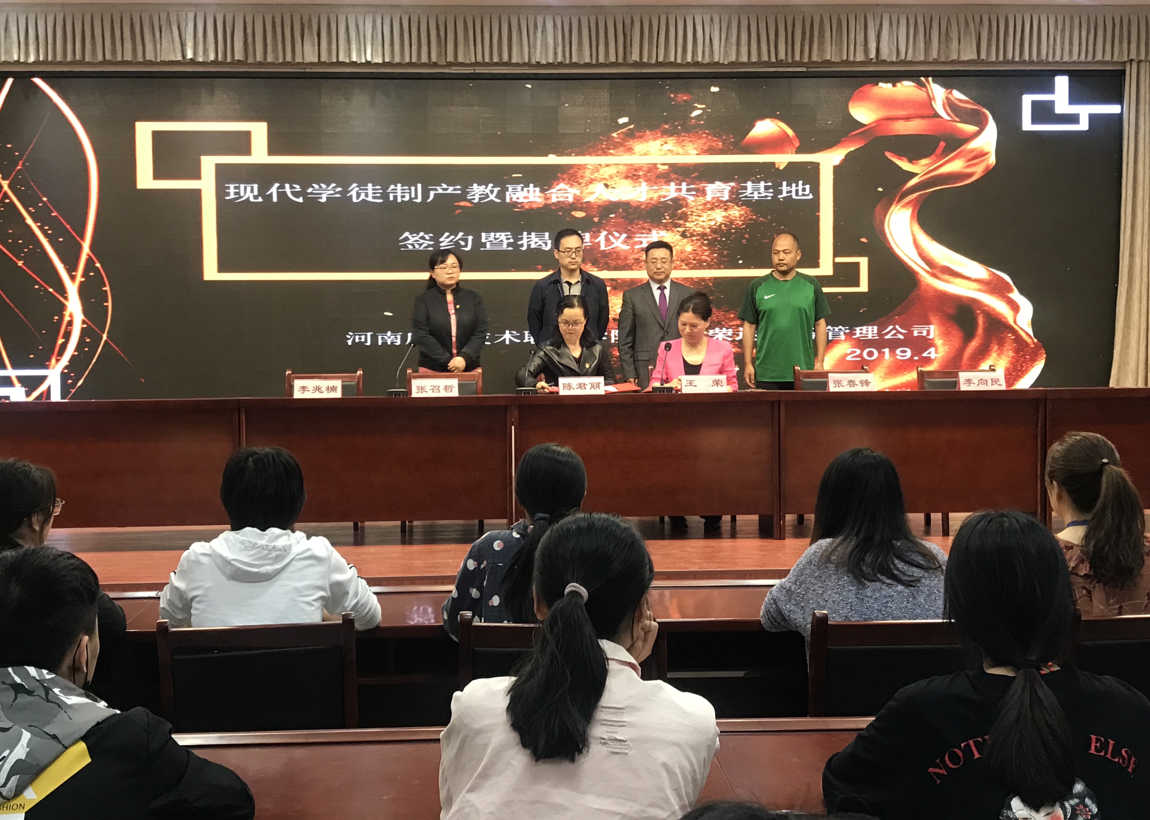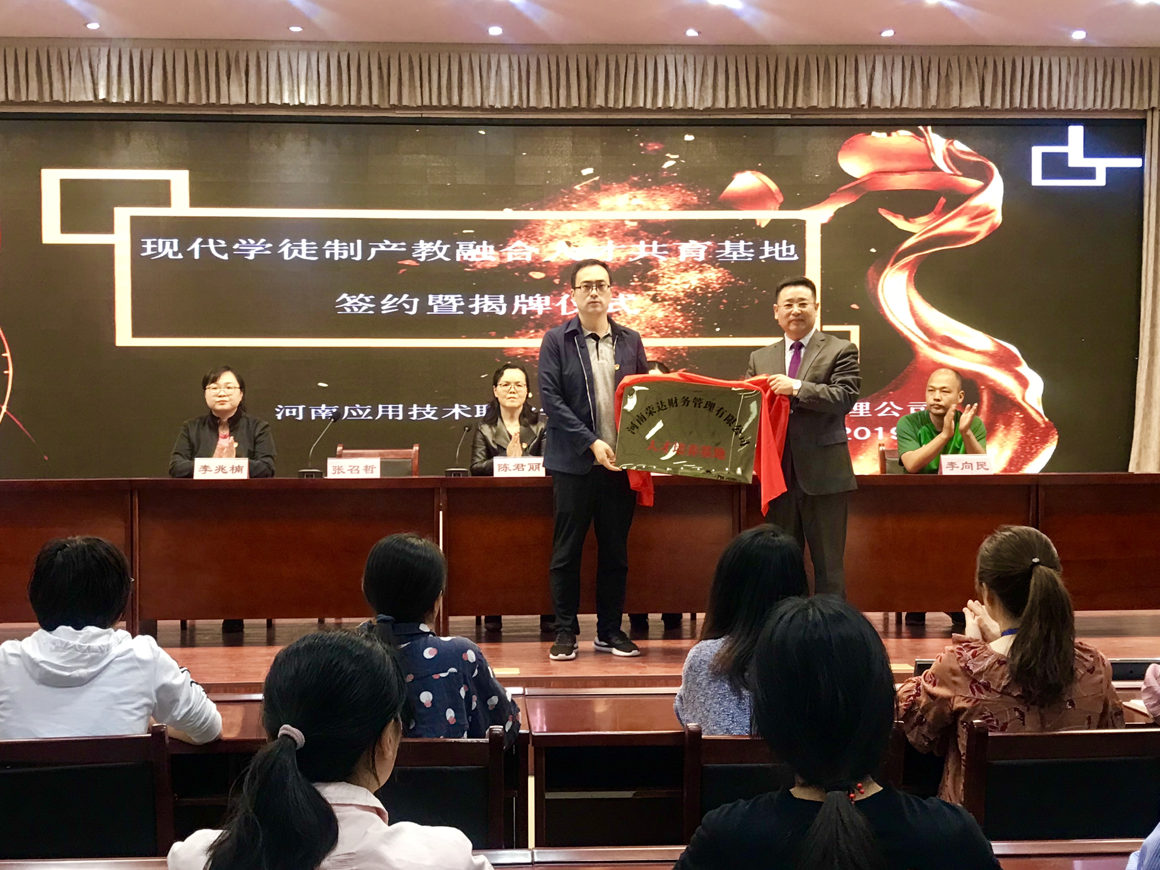 2019年4月18日,Beat365中文官方网站与河南荣达财务管理公司在实训楼二楼会议室举行现代学徒制产教融合人才培养基地签约暨揭牌仪式。出席签约仪式的有学校副校长陈君丽教授、招生就业处李向民处长、Beat365中文官方网站张召哲院长、党总支李兆楠书记、荣达财务管理公司王荣董事长、张春锋总经理及Beat365中文官方网站的全体教师和学生代表。