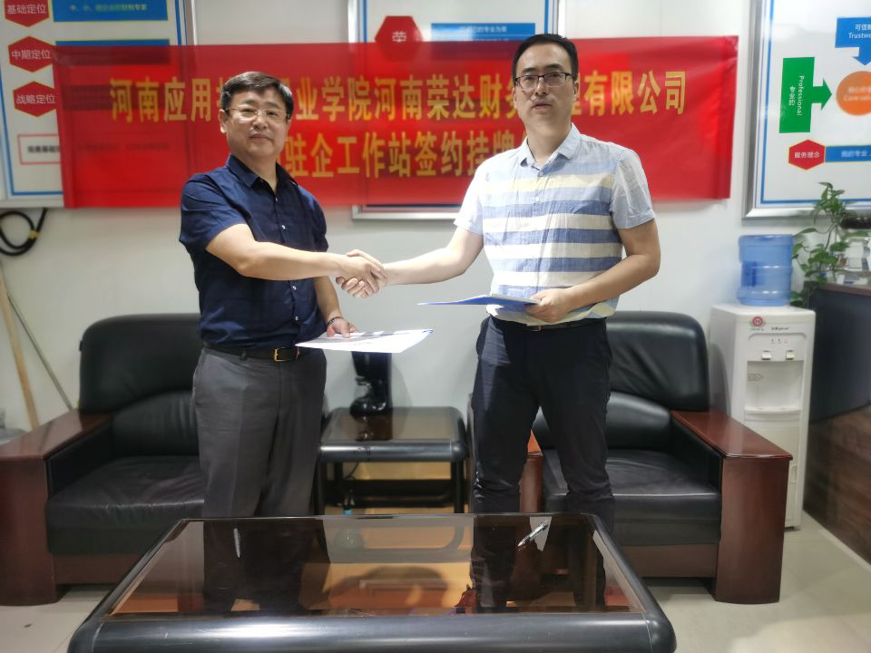 双方就如何有效依托“教师驻企工作站”开展人才培养、师资力量提升、服务地方经济等问题进行了深度探讨。随后Beat365中文官方网站张召哲院长和荣达财务管理有限公司总经理张春风分别代表校企签订了合作框架协议书,并在双方人员共同见证下为Beat365中文官方网站教师驻河南荣达财务管理有限公司工作站进行揭挂牌。
