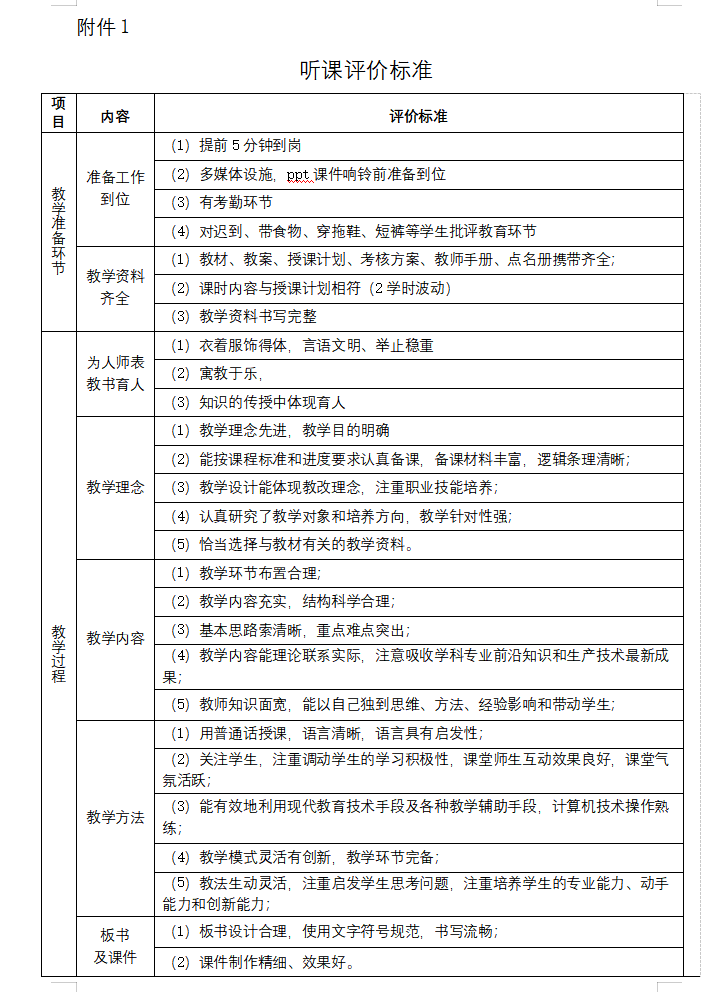 1.院长、副高级及以上职称教师、教学办主任、教研室主任、每学期按组别听课,填写附件1听课评价标准;副高级及以上职称听课不少于10次