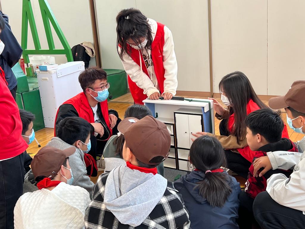 随着下课铃声响起,小朋友们向体育馆飞奔而来,等待一堂别样的课堂。志愿者们帮忙维持现场秩序。在分工分组之后,志愿者们现学现卖,把刚刚老师教的内容手把手教给交朋友,让小朋友在面临相似场景时,能够及时自救,提高生存能力。