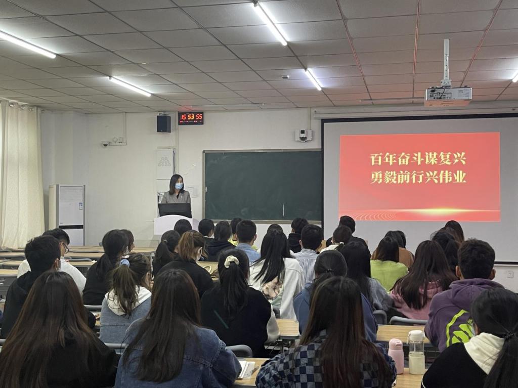 2022年4月28日下午,Beat365中文官方网站党委委员、纪委书记陈雅莉老师在双创教学楼104为Beat365中文官方网站学生讲授了一堂题为“百年奋斗谋复兴,勇毅前行兴伟业”的形势与政策课。