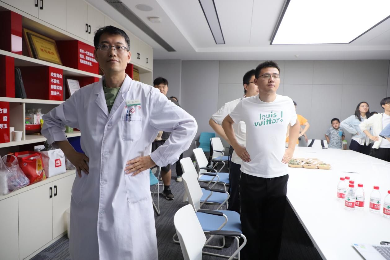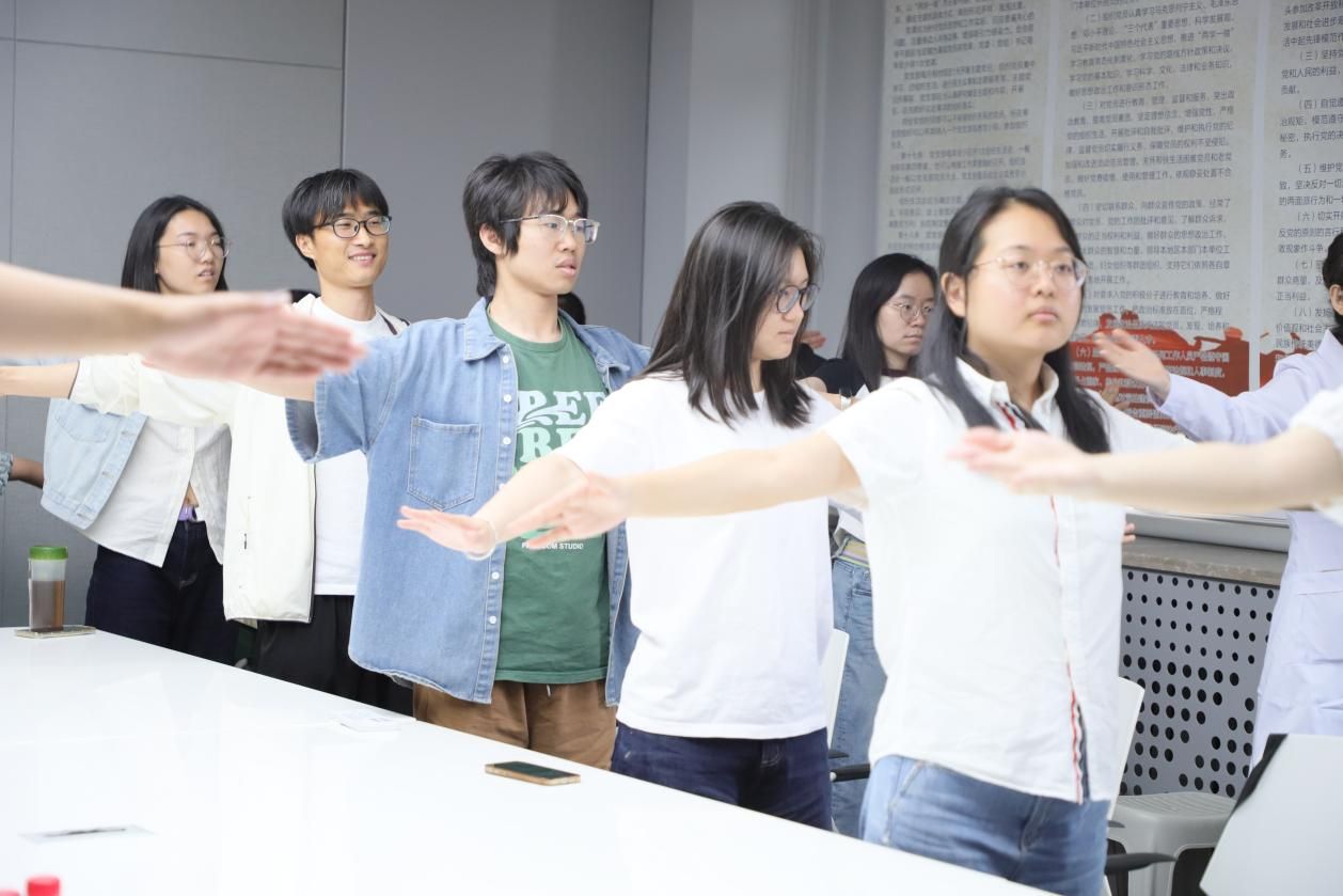 讲解结束后,梁乐乐、汤燕、朱雅等三位医生起身走到场地中央,带领在场的学生和教职工做起了肩颈操。“双手向上伸直,慢慢向后拉伸……” 医生们一边耐心地示范标准动作,一边细致地讲解每个动作对肩颈部位的保健作用。学生和教职工们认真跟随,舒展僵硬的肩颈,现场气氛活跃。在轻松的互动中,大家学习到了实用的肩颈放松技巧,有效缓解了日常学习和工作带来的疲劳。