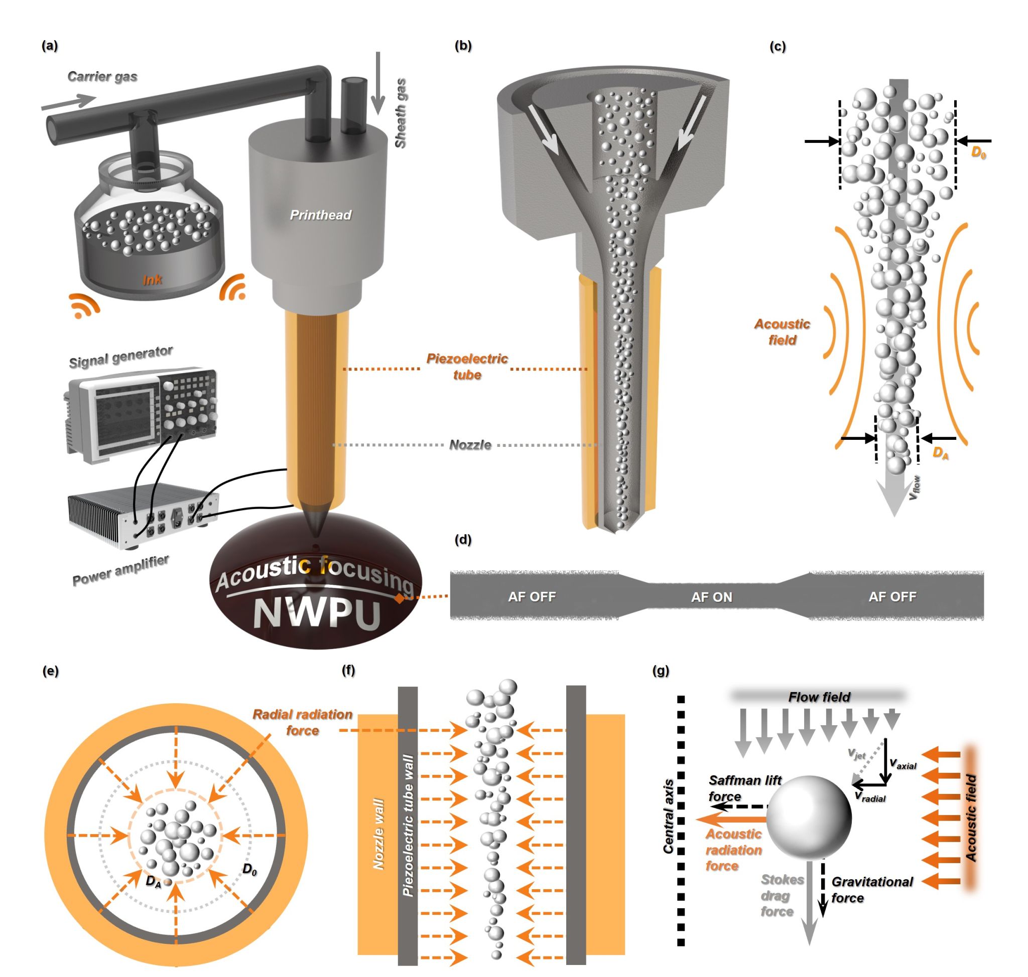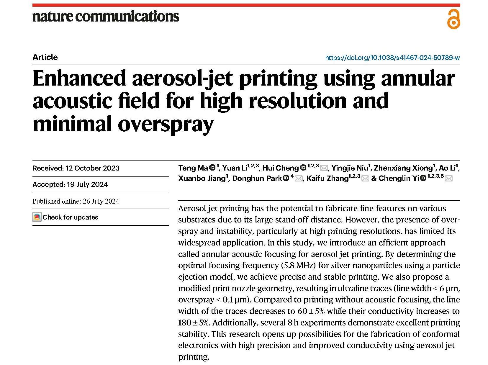 近日,新葡萄8883官网AMG官网张开富教授团队在气溶胶喷墨打印方向取得了新进展,成功发展了外加声场辅助聚焦的超高精度气溶胶喷墨共形打印策略,突破了行业的极限分辨率,在高精度、高集成共形电子制造领域具有重要应用潜力,研究成果以“Enhanced aerosol-jet printing using annular acoustic field for high resolution and minimal overspray”为题发表在Nature Communications(2024, 15, 6317)上。论文第一作者为博士研究生马腾,通讯作者为张开富教授、程晖教授和易城林教授。原文链接:https://doi.org/10.1038/s41467-024-50789-w