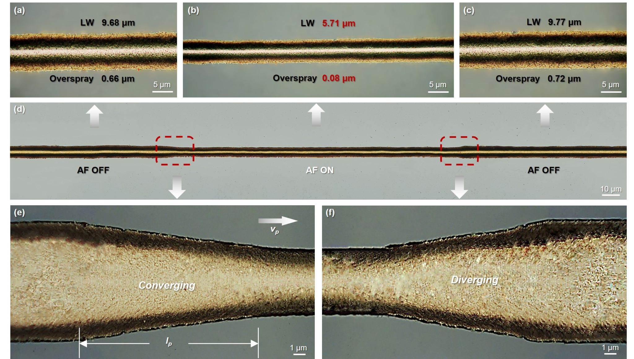 研究对传统的打印喷嘴结构进行了改型优化,从而将环形压电致动器集成于新型喷嘴之外,并通过确定适用于气溶胶纳米颗粒的最佳聚焦频率(5.8MHz),对喷射的气溶胶油墨液滴进行声聚焦补偿,最终实现了精确而稳定高分辨打印。结果表明,声聚焦辅助的气溶胶喷墨打印线宽小于6μm,过度喷涂小于0.1μm。这相比于传统打印,极限分辨率被突破达60±5%,导电性增加至180±5%。