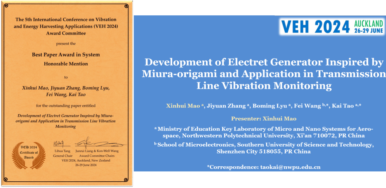 新葡萄官网微系统工程系博士生毛新辉、硕士生张继元参加了此次大会。发表了题为“Development of Electret Generator Inspired by Miura-origami and Application in Transmission Line Vibration Monitoring”的口头报告,获得了参会人员的广泛好评,并获“VEH2024最佳论文奖”。