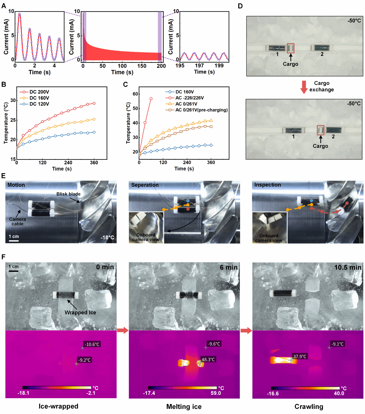 在极寒环境测试中,机器人可在-50°C环境下完成自主加热、以及巡检和冰层融化等任务。在航空发动机叶片检测、狭缝探测和寒区作业等应用场景中展现出显著优势。相关成果为极端环境下小型智能机器人系统的研发提供了新思路,也展示了该类材料在电子器件、仿生系统和智能制造等领域的广泛应用前景。