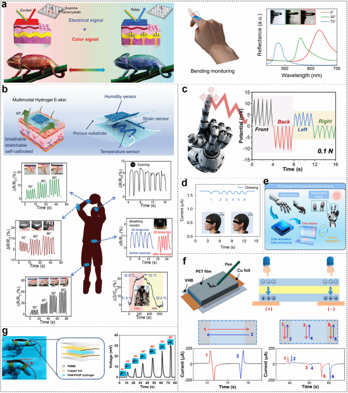 图7. 自供能水凝胶传感器应用于智能感知。(a)仿生结构色电子皮肤;(b)仿生多模态电子皮肤及其在人体运动监测中的应用;(c)应用于机器人手的双模态柔性电子皮肤;(d)用于咀嚼监测的热原电池水凝胶电子皮肤;(e)搭载深度学习算法的智能电子皮肤;(f)基于三层水凝胶设计的智能电子皮肤;(g)类皮肤韧性水凝胶电子皮肤。