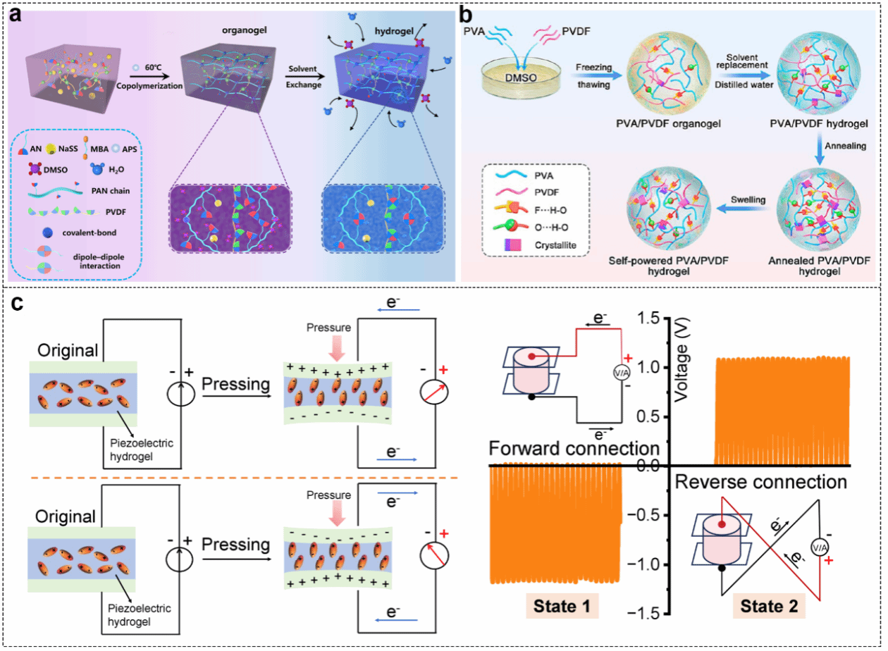 图6. 压电式自供能水凝胶传感器。(a)PAN-PVDF水凝胶的形成及其机电响应特性;(b)压电型PVA/PVDF复合水凝胶及其发电能力;(c)P(AM-co-AN)水凝胶的工作原理与压电输出特性。