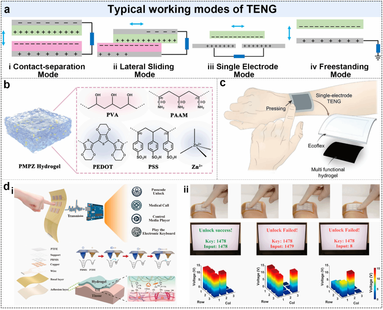 图5. 摩擦电式自供能水凝胶传感器。(a)TENG的典型工作模式;(b)基于三重网络水凝胶的TENG;(c)多功能水凝胶-弹性体作为可拉伸TENG;(d)TENG阵列作为人机交互界面及其性能表征。