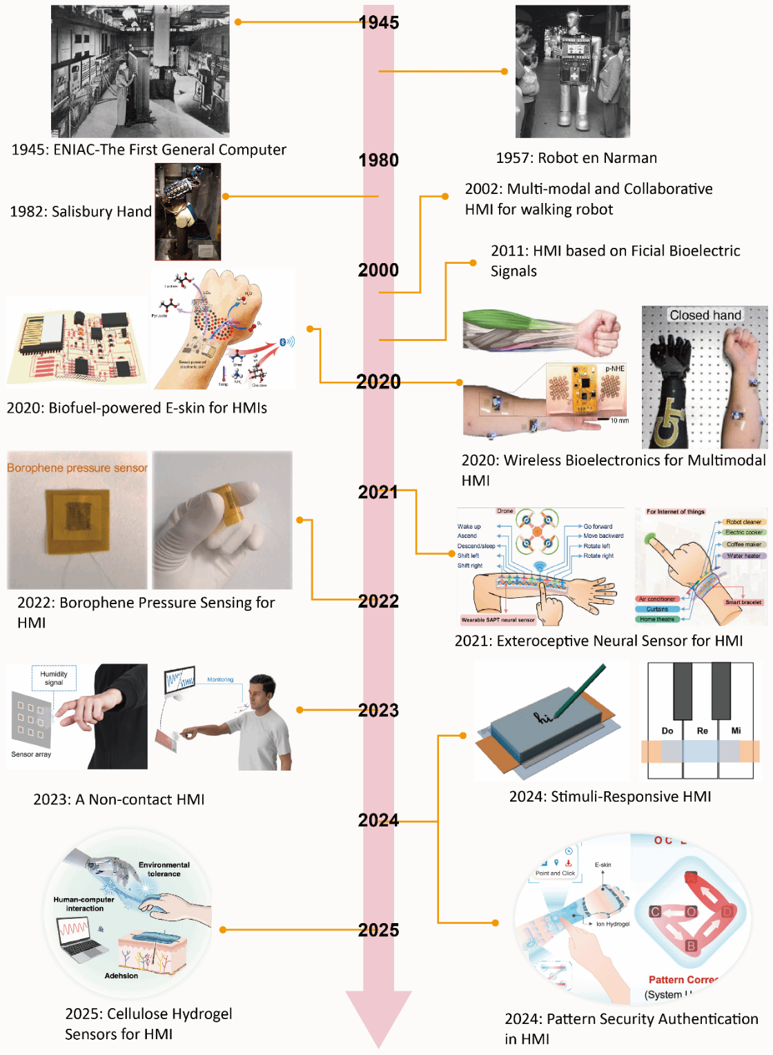 图1. 基于材料科学发展和功能需求演变的人机交互系统发展历程。