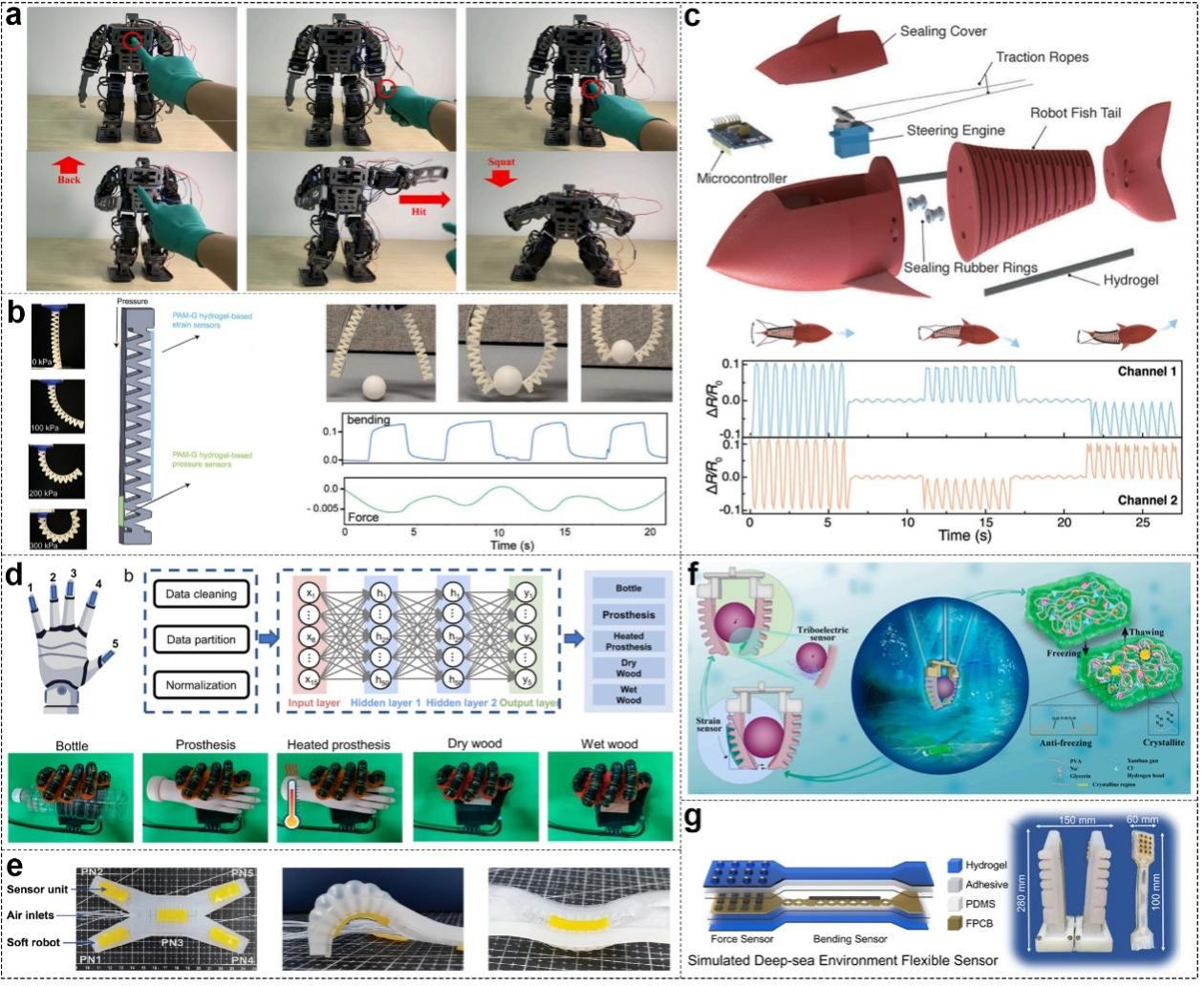 图8. 自供能水凝胶传感器应用于机器人感知增强。(a)基于MXene水凝胶压力传感器的机器人触觉感知系统;(b)环境适应性水凝胶机器人传感材料;(c)水下机器人用抗疲劳水凝胶应变传感器;(d)环境物体识别用多模态电子皮肤;(e)软体机器人多模态电子皮肤;(f)具备深海触觉感知的软体机械手;(g)应变-摩擦电一体式电子皮肤实现的水下软体机器人抓取系统。
