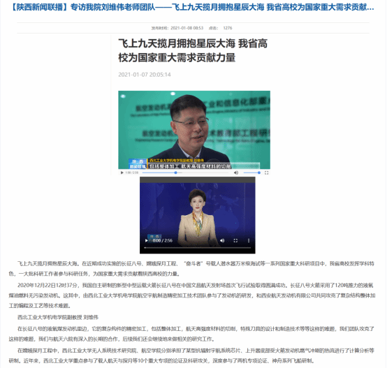 5.4.5【陕西新闻联播】专访新葡萄官网刘维伟老师团队——飞上九天揽月拥抱星辰大海 我省高校为国家重大需求贡献力量